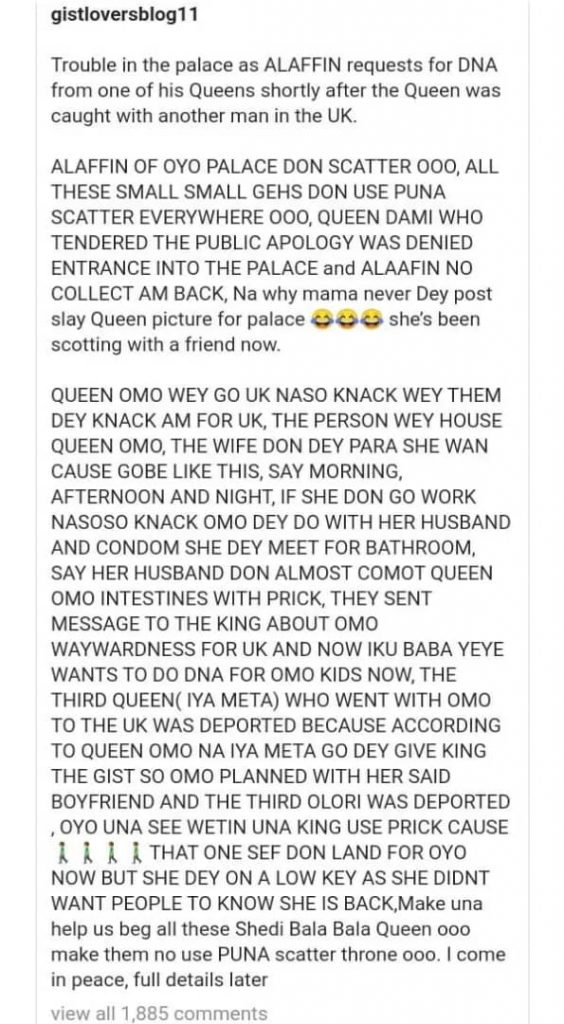 “THEY SENT MESSAGE TO THE KING ABOUT OMO WAYWARDNESS FOR UK AND NOW IKU BABA YEYE WANTS TO DO DNA FOR OMO KIDS NOW, THE THIRD QUEEN( IYA META) WHO WENT WITH OMO TO THE UK WAS DEPORTED BECAUSE ACCORDING TO QUEEN OMO NA IYA META GO DEY GIVE KING THE GIST SO OMO PLANNED WITH HER SAID BOYFRIEND AND THE THIRD OLORI WAS DEPORTED.”