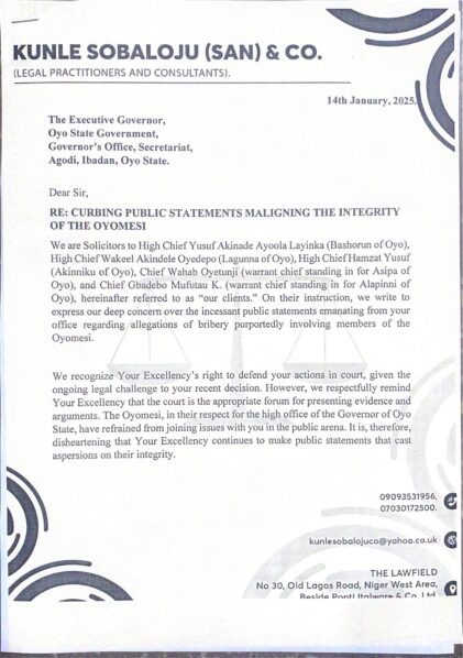 However, the Oyomesi – High Chief Yusuf Akínade, Bashorun of Oyo; High Chief Wakeel Akindele, Lagunna of Oyo; High Chief Hamzat Yusuf, Akinniku of Oyo; Chíef Wahab Oyetunji, warrant chief stand-in for Asipa of Oyo, and Chief Gbadebo Mufutau, warrant chief stand-in for Alapinní of Oyo – expressed their displeasure in a letter to the Governor signed by their legal representative, Adekunle Sobaloju (SAN).