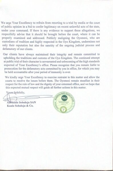 “Oyomesi remains steadfast in preserving the cultural heritage of Oyo. “Please recognize that you remain liable to prosecution for the defamatory acts committed by you in office, for which you may be held accountable after your period of immunity is over.”