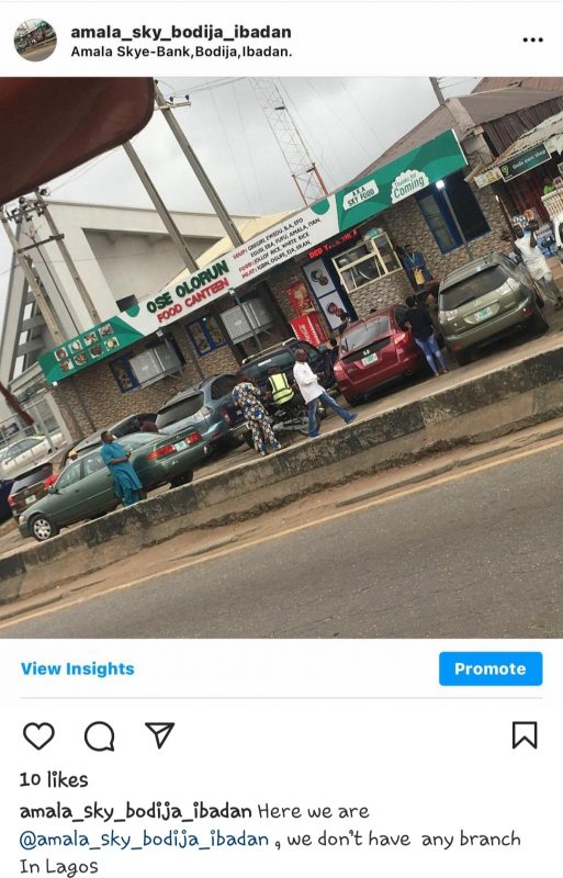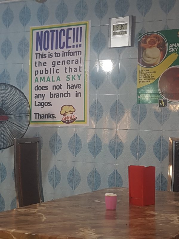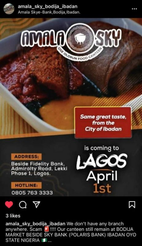 However, in a release on the official Instagram handle of Amala Sky Ibadan and in their restaurant in Ibadan, the Management of the Ibadan restaurant denied having any branch in Lagos.