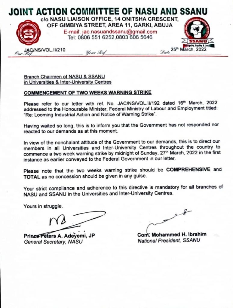 The Joint Action Committee of the Non-Academic Staff Union and the Senior Staff Association of Nigerian Universities has announced the commencement of two weeks warning strike.
