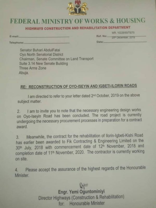 The federal government has reponded to the letter of Oyo North senator, Fatai Buhari, over the dipilated conditions of Oyo-Iseyin and Igbeti-Ilorin roads.