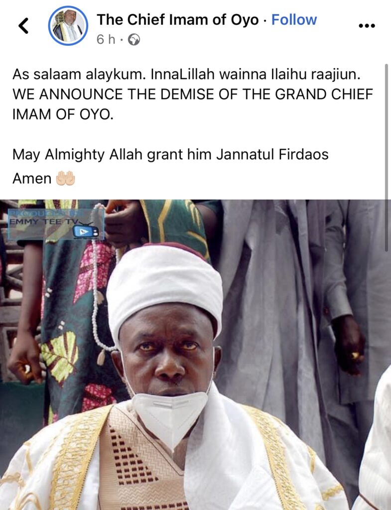 It reads: “As salaam alaykum. InnaLillah wainna Ilaihu raajiun. We Announce The Demise of the Grand Chief Imam Of Oyo. May Almighty Allah grant him Jannatul Firdaos. Amen ”