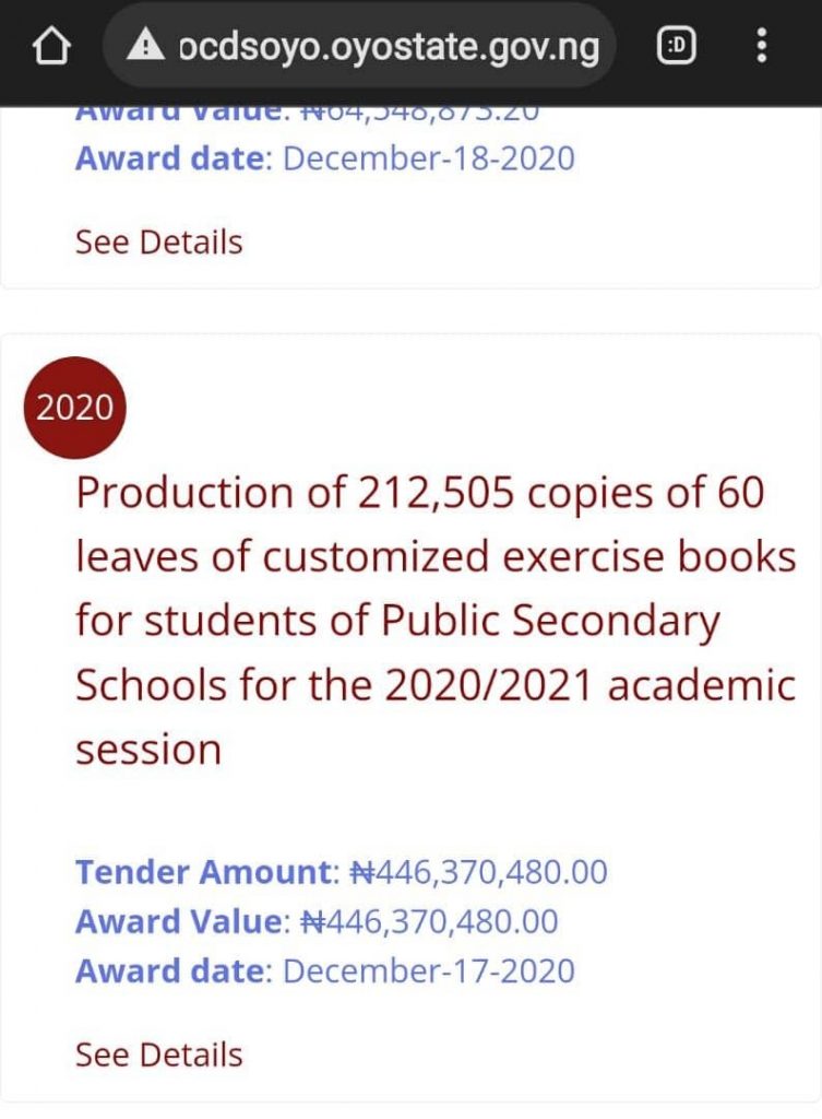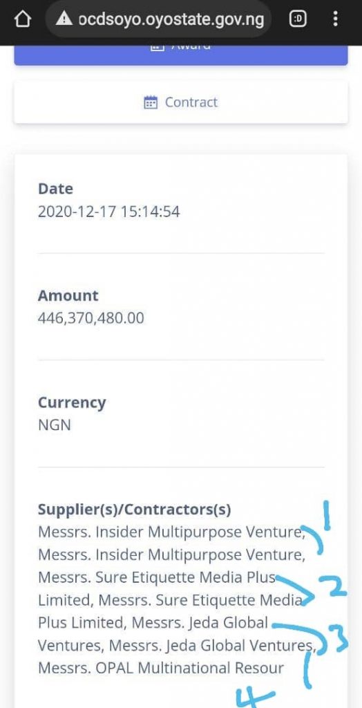 A visit to the Oyo State Open Contracting Portal (http://ocdsoyo.oyostate.gov.ng) showed that the contract being argued about was awarded in December, 2020 for the sum of N446,370,480.00.