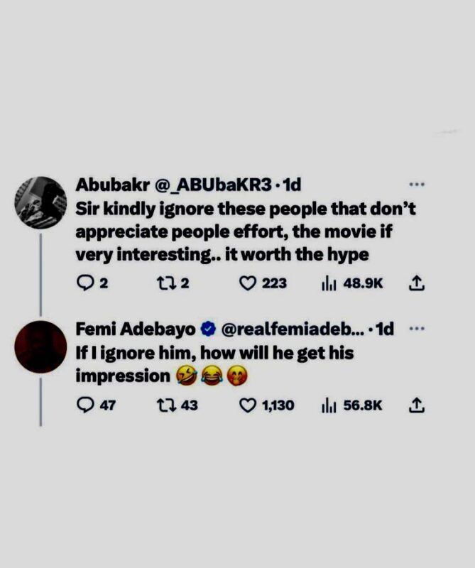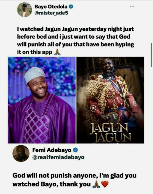 Actor and producer Femi Adebayo has responded to a recent Twitter comment criticizing the movie “Jagun Jagun.” The comment, which expressed dissatisfaction with the film, caught the attention of Adebayo, who played a prominent role in the production.