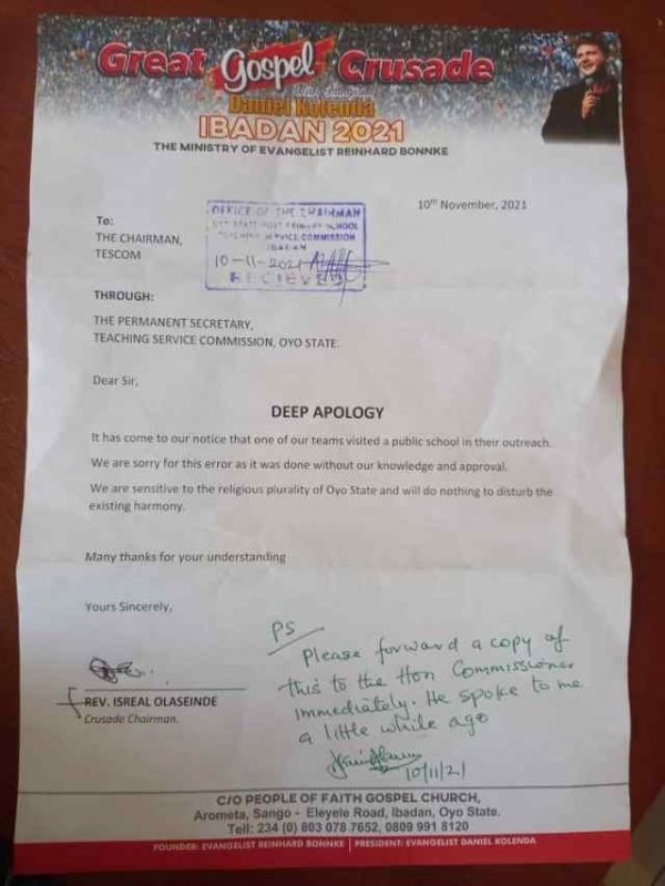 Meanwhile, the content of the letter has shown that the crusade organisers regret the error.