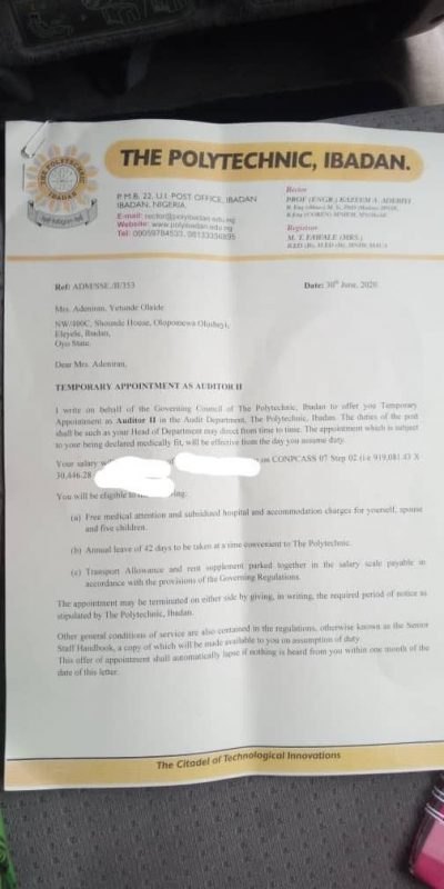 The letter of employment was presented to the widow by the Honorable Commissioner for Education on Monday, on behalf of Governor Seyi Makinde.