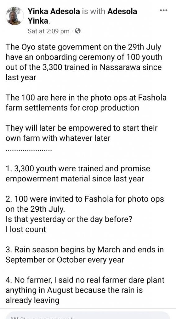 I was shocked, to say the least, to read this rant by Yinka Adesola, who claims to be a “professional farmer, an agribusiness trainer and consultant. First off, wrong data. She stated that the Oyo State Government sent 2,000 youths to Nasarawa. No ma’am. The Oyo State Government trained 3,300 youths on technology-based agri-food systems at the CSS Integrated Farms at Gora, Nasarawa State.