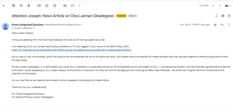 “I am reaching out to you concerning this story published on FIJ and tagged in your name on the 20th of May, 2023. (https://fij.ng/article/lukman-gbadegesin-kept-n200m-to-lobby-for-alaafin-but-wont-settle-n48m-indebtedness-to-friend/).
