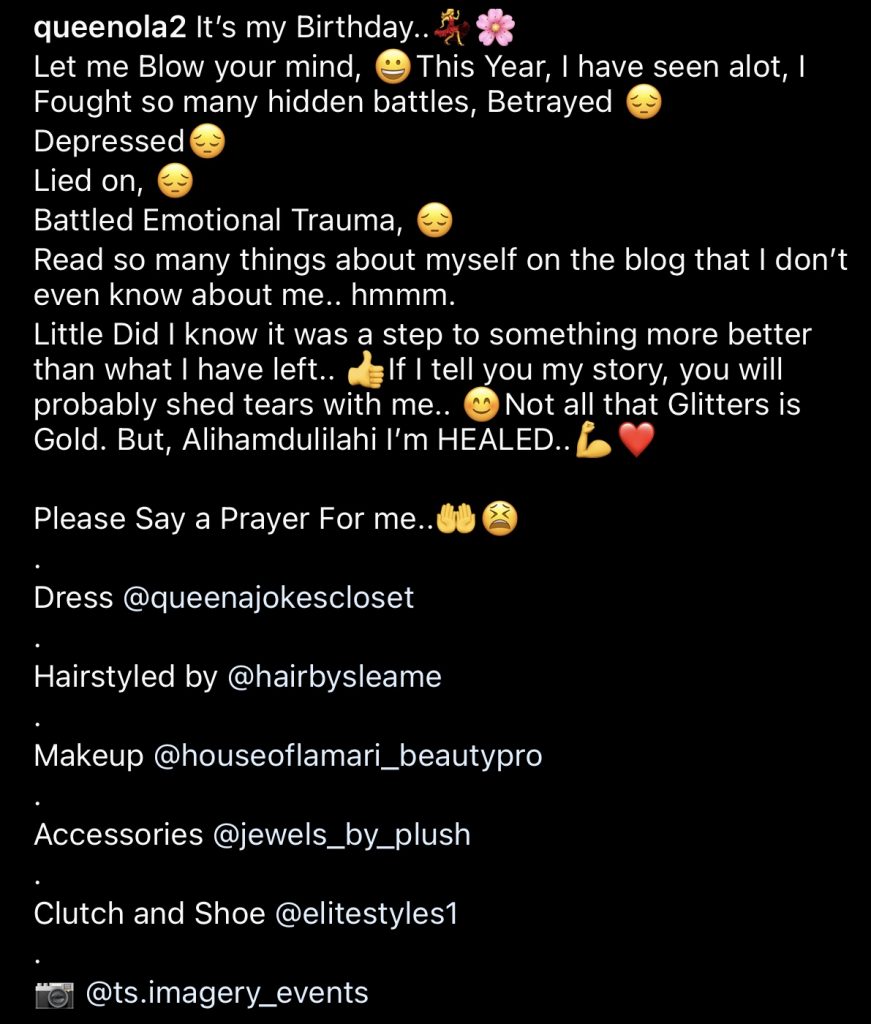 In an Instagram post on Tuesday, Queen Ola shared a picture of herself in a ball dress with a note revealing the challenges she’s been through.