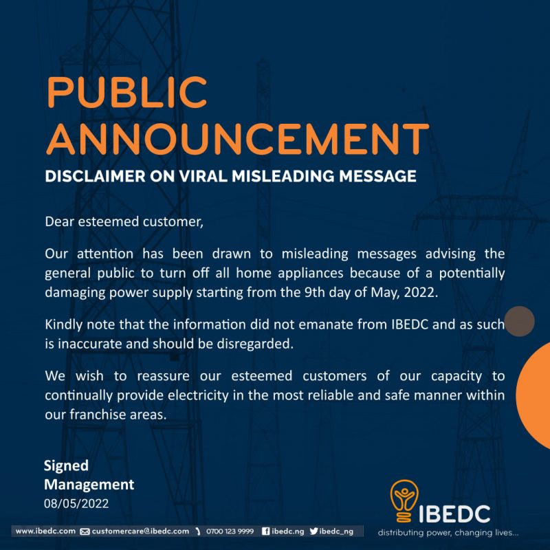 The disclaimer released on Sunday however reads: “Our attention has been drawn to misleading messages advising the general public to turn off all home appliances because of a potentially damaging power supply starting from 9th day of May, 2022.