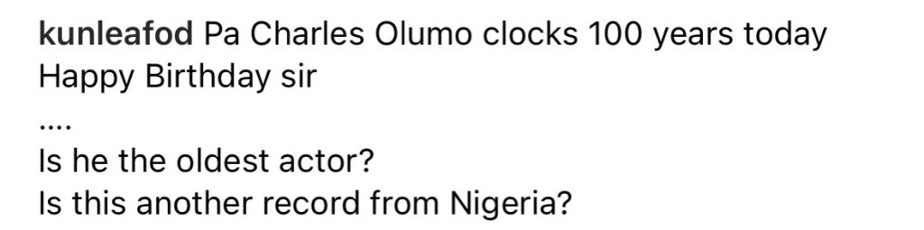 The actor who shared a picture of the Veteran Actor on his Instagram page wrote, “Pa Charles Olumo clocks 100 years today. Happy Birthday sir.”