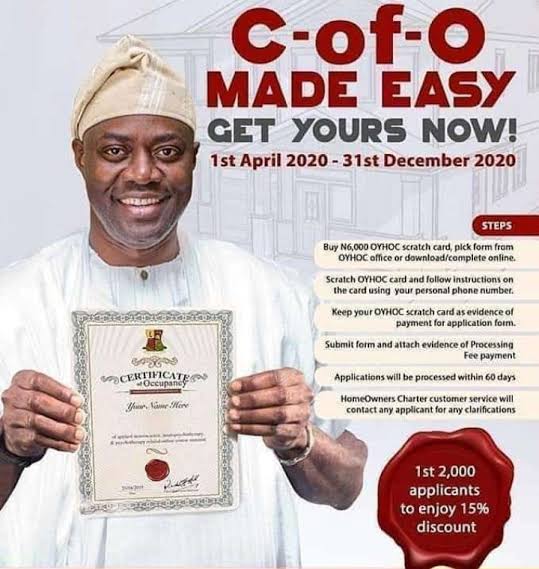 According to the Commissioner for Lands, Housing and Urban Development, Barrister Abiodun Abdu-Raheem, the extension was necessitated due to the clamour for more time by property owners in the state to apply for the C of O under the OYHOC Scheme.