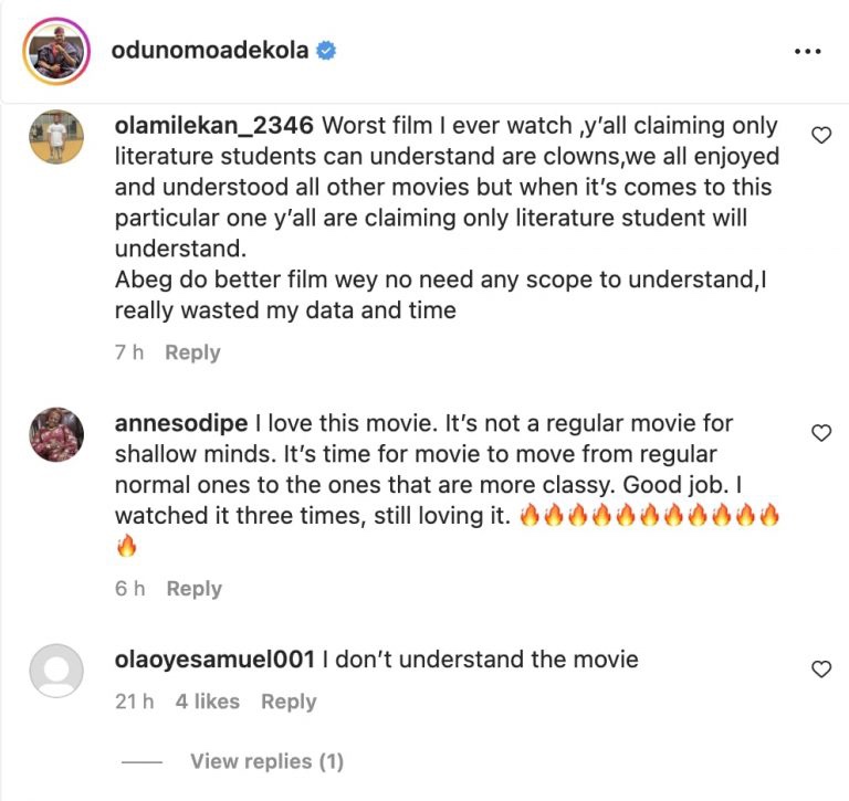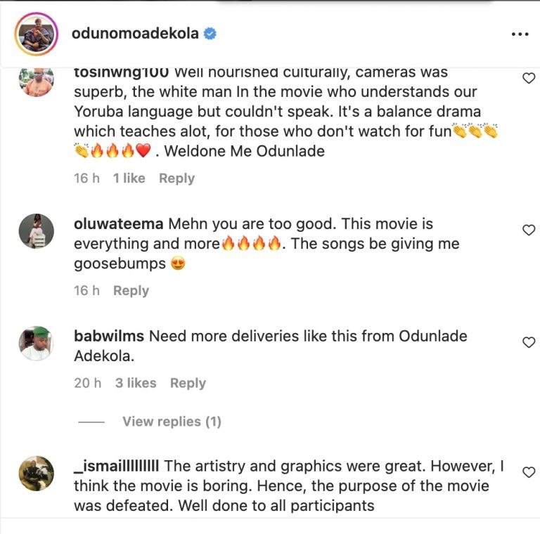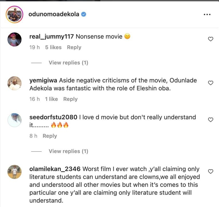 Reactions which is not only on the general criticism of the movie but also on the role of ace Nollywood actor, Odunlade Adekola surfaced on the comment section of the Actors Page, when he posted a gram commending the effort of fellow casts in the movie.