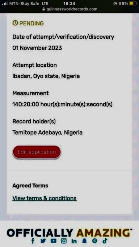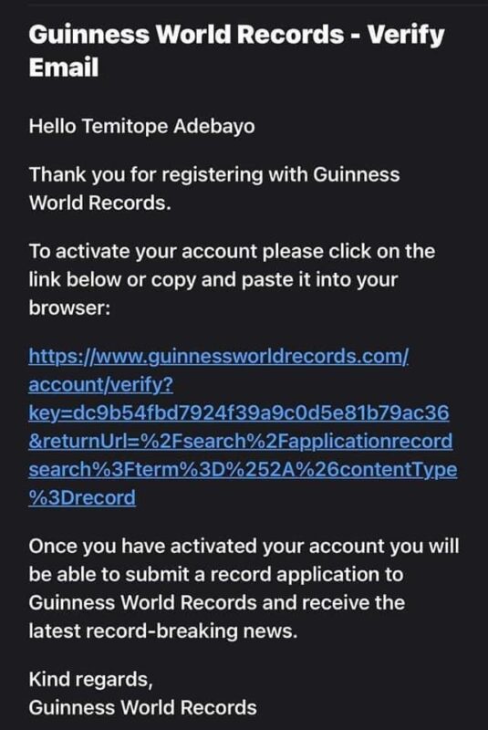 Adebayo shared screenshots of his registration to the Guinness World Record and a verification email he had received. The screenshots revealed that his 140-hour cook-a-thon is scheduled for the 1st of November 2023 in Ibadan, Oyo state.