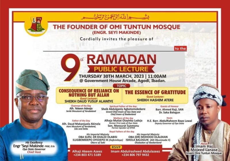 The annual Governor ‘Seyi Makinde’s Omituntun Ramadan Public lecture has been scheduled to hold on Thursday, 30th of March, 2023.