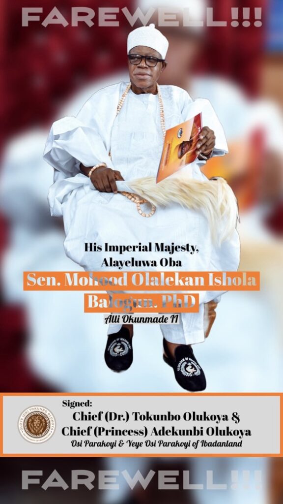 It is with deep sadness and a heavy heart that we, Chief (Dr) Tokunbo Olukoya and Chief (Princess) Adekunbi Olukoya, the Osi Parakoyi and Yeye Osi Parakoyi of Ibadan Land, mourn the passing of the esteemed Olubadan of Ibadan Land, HIM Oba Dr, Sen. Mohood Lekan Balogun, Alli Okunmade 2. We join the entire Ibadan Land in grieving the loss of an exceptional leader, a revered figure, and a beloved father to all.