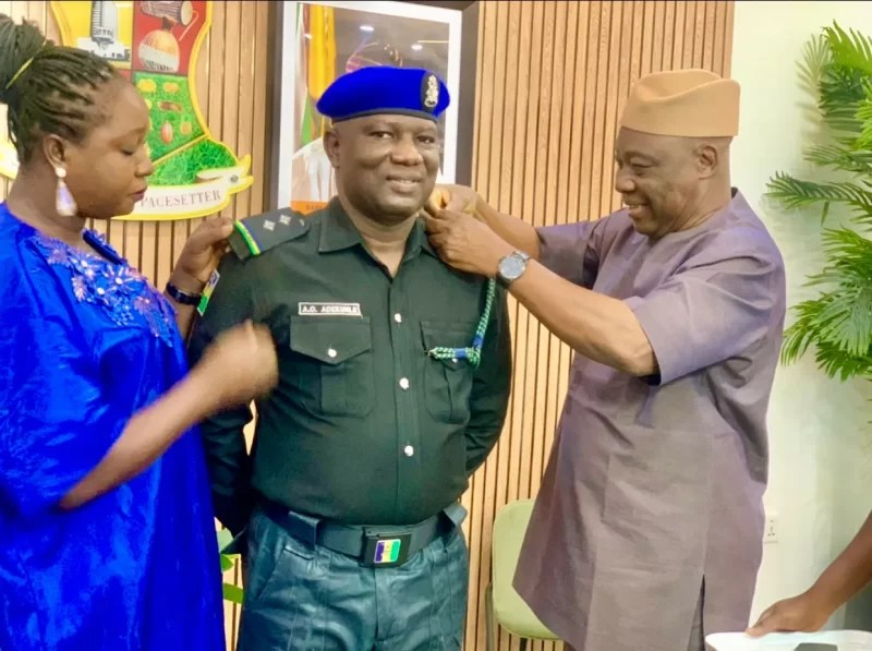 The Acting Governor of Oyo State, Barr. Bayo Lawal has on Monday decorated his convoy excort commander, Mr Adekunle Odejimi, with his new rank of Superintendent of Police 1.
