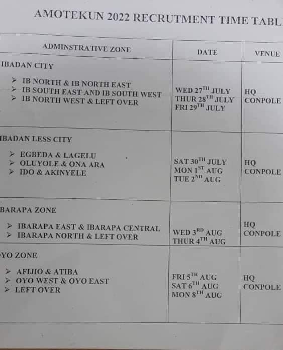 The Oyo State Western Nigeria Security Network (WNSN) codenamed Amotekun Corps, has announced the screening date and venue for 2022/2023 prospectives applicants, basically Oyo State indigenes.