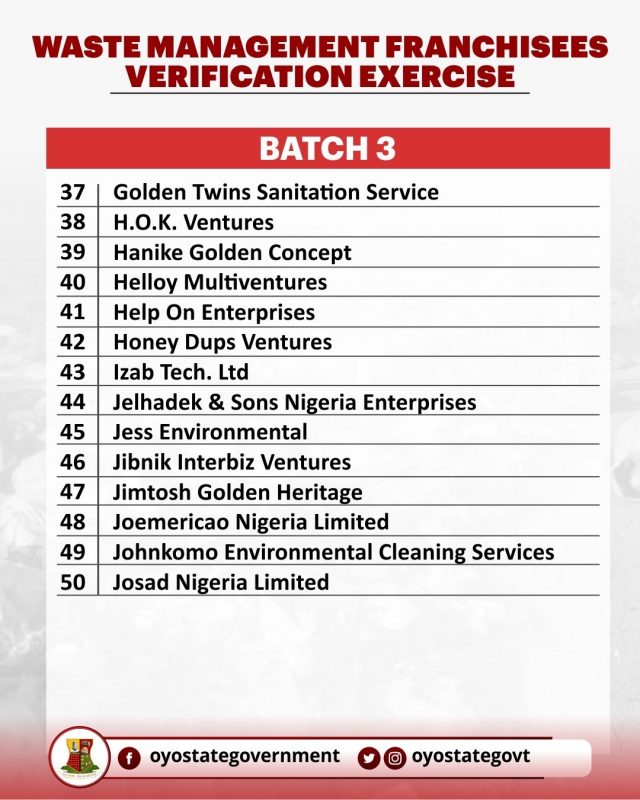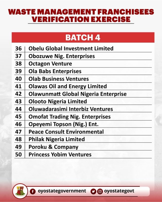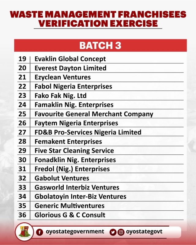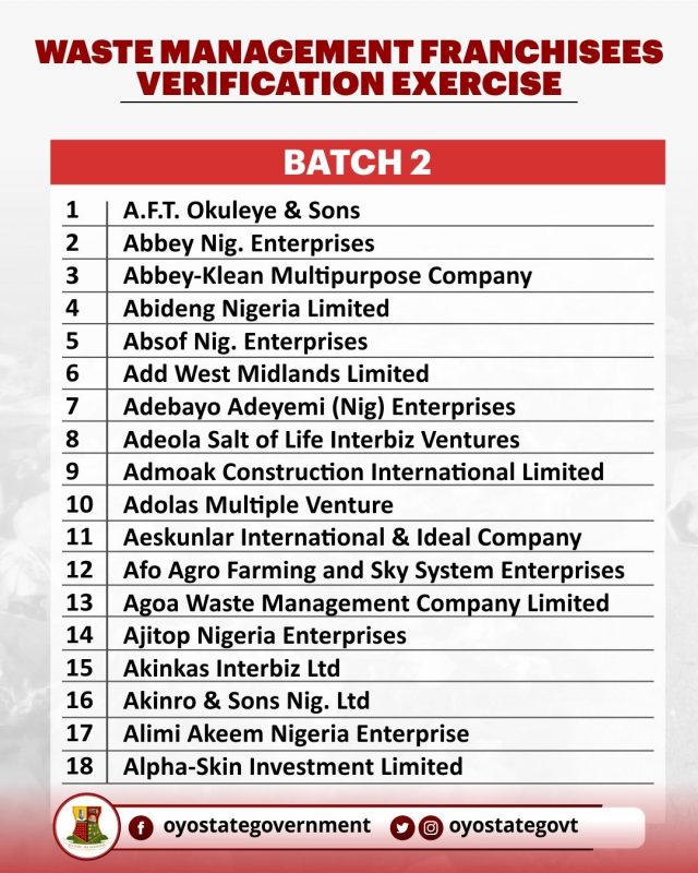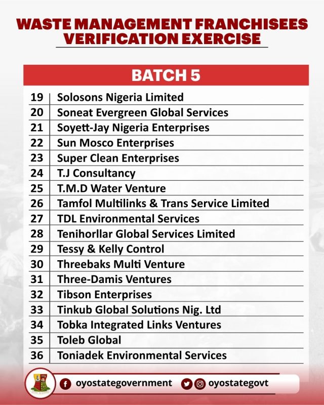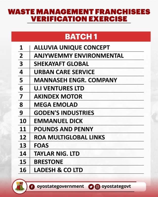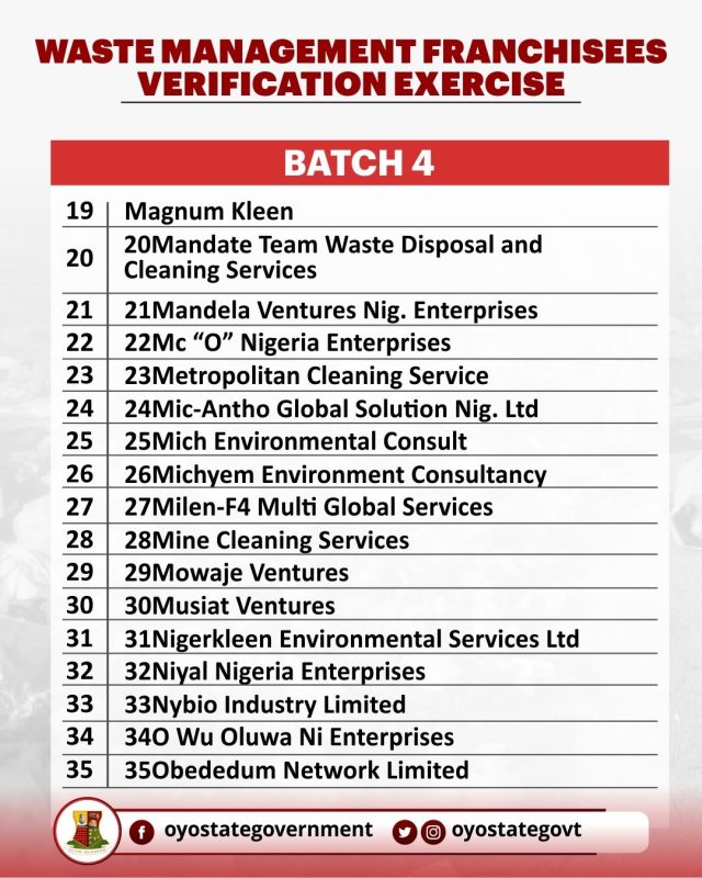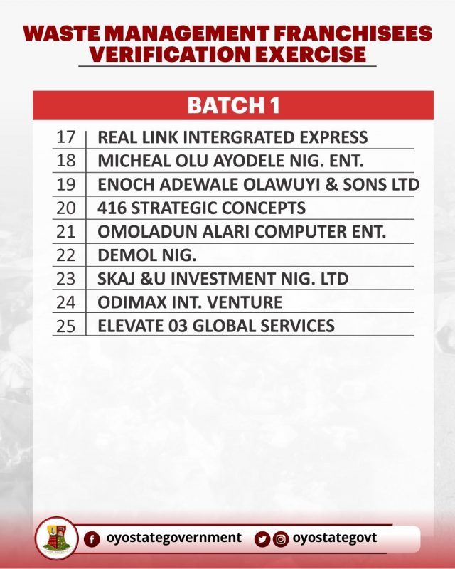 The Oyo State government through the Oyo State Waste Management Authority, OYOWMA has announced the screening schedule for private sector participants, PSPs in the state.