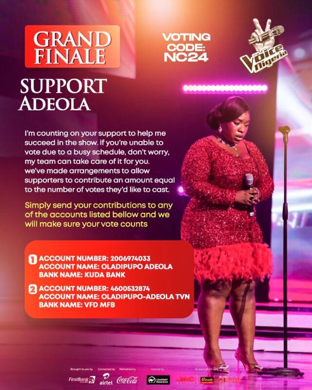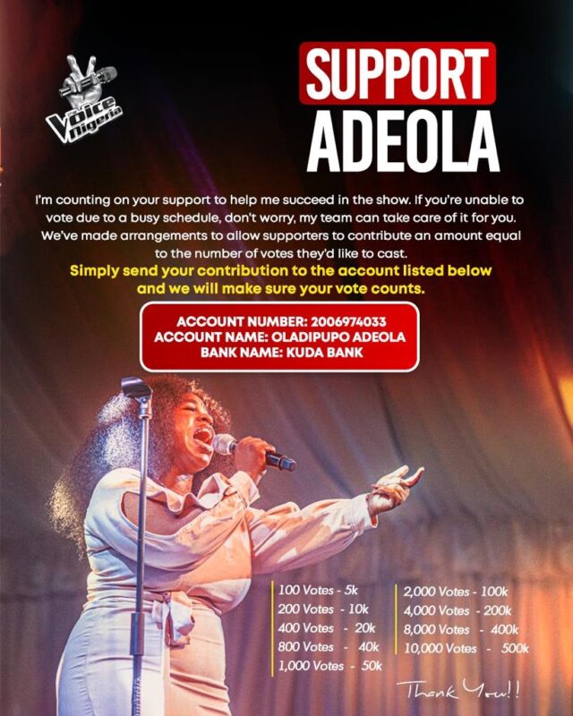 The voting process is ongoing and will end on Thursday, May 18th, 2023. Adeola Oladipupo is counting on the support of her fellow Nigerians to help her achieve her dream of becoming The Voice Nigeria’s season 4 champion.