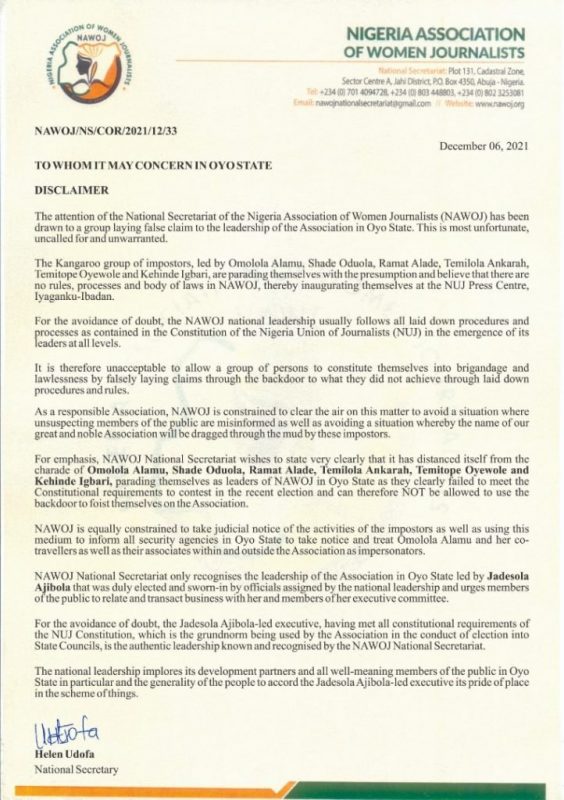 “NAWOJ is equally constrained to take judicial notice of the activities of the impostors as well as using this medium to inform all security agencies in Oyo state to take notice and treat Omolola Alamu and her co-travellers as well as their associates within and outside the association as impersonators.