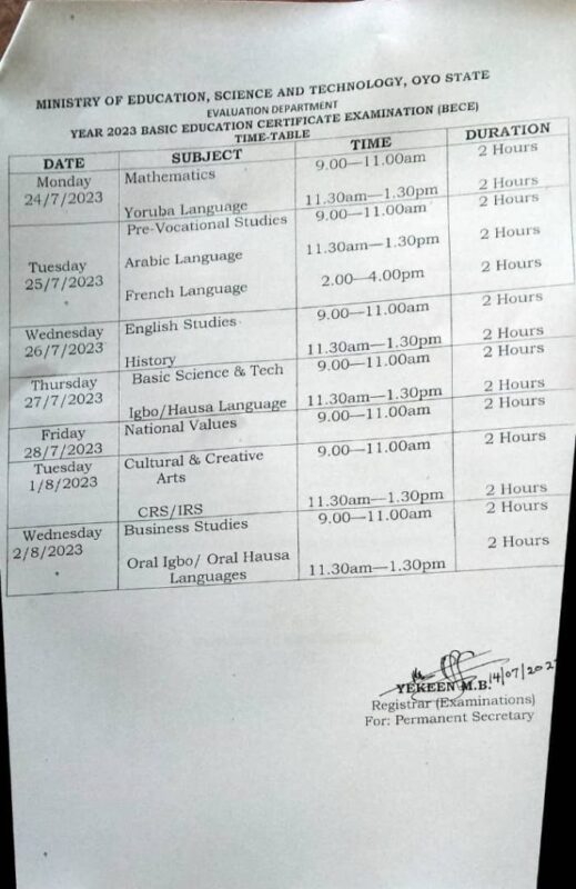 BECE is a significant assessment for students transitioning from basic education to secondary education. The release of the time table demonstrates the Oyo State government’s commitment to providing quality education and maintaining a standardized examination process. Schools, teachers, and students are urged to align their study plans and revision schedules accordingly.