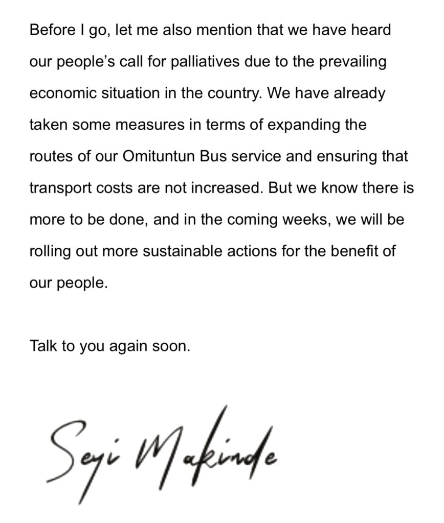 He said, “We have heard our people’s call for palliatives due to the prevailing economic situation in the country. We have already taken some measures in terms of expanding the routes of our Omituntun Bus service and ensuring that transport costs are not increased. But we know there is more to be done, and in the coming weeks, we will be rolling out more sustainable actions for the benefit of our people.”