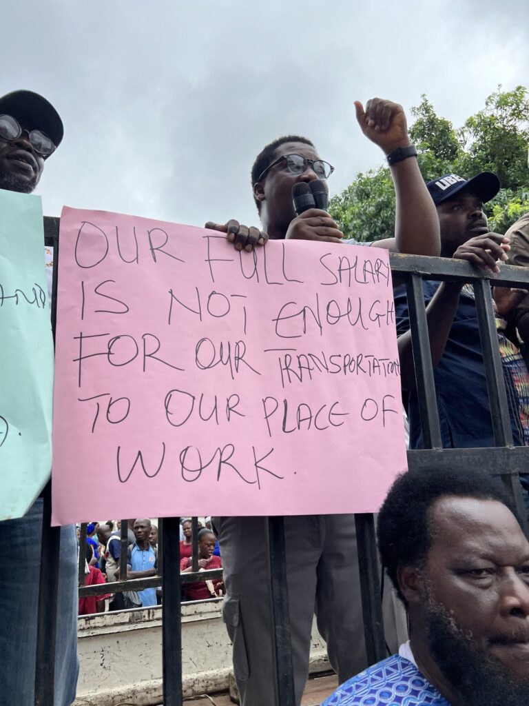 However, the leadership of the NLC insisted on going on strike unless Governor Makinde addressed them directly. Some inscriptions on their placards read: “We want to meet with the Governor and not his representative” and “Our full salary is not enough for our transportation to our place of work.”