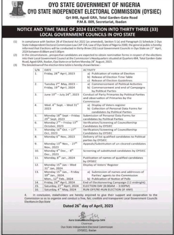 The Oyo State Independent Electoral Commission, OYSIEC has released a timetable for election into the 33 local government areas in Oyo State.