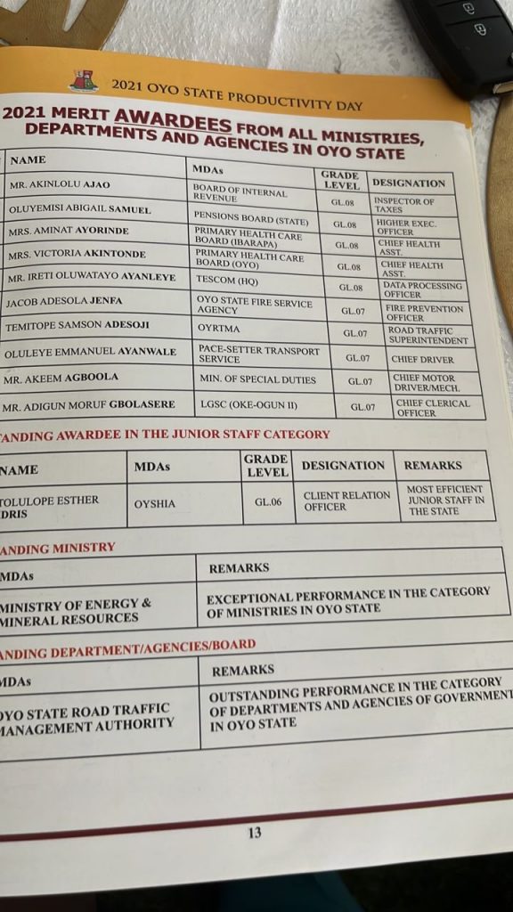 Also, an Officer of the Agency, RTS, Temitope Samson Adesoji has been recognised as an outstanding civil servant in the year 2021 by the Oyo State government.