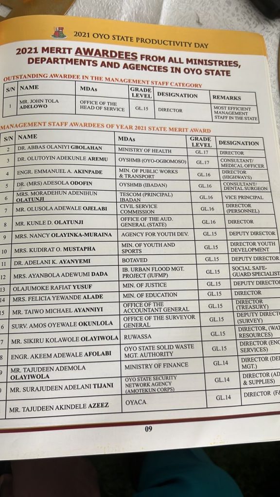 The three outstanding awardees of the most efficient civil/public servant for 2021 are: Mr John Tola Adelowo (most efficient management staff in the state), Tijani Nurudeen Adeniyi (most efficient senior staff in the state) and Tolulope Esther Idris (most efficient junior staff in the state).