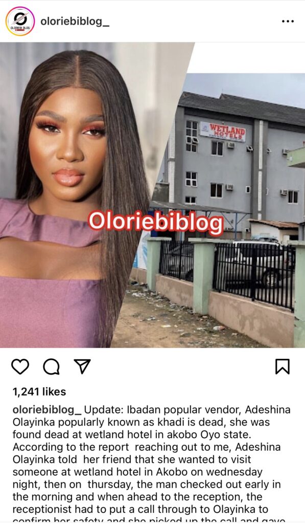 According to the report posted by Oloriebiblog on their official Instagram page, noted that Khadi was reported dead after she had an earlier lodge with a man who is yet to be identified.