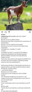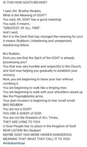 Bamiloye, in a post on his Instagram Social platforms, maintains that the slang “GOAT” means stubborn, headstrong, disobedient, and unbelieving people in the Bible, while sheep symbolizes the children of God, adding that GOAT people have no place in the Kingdom of God.