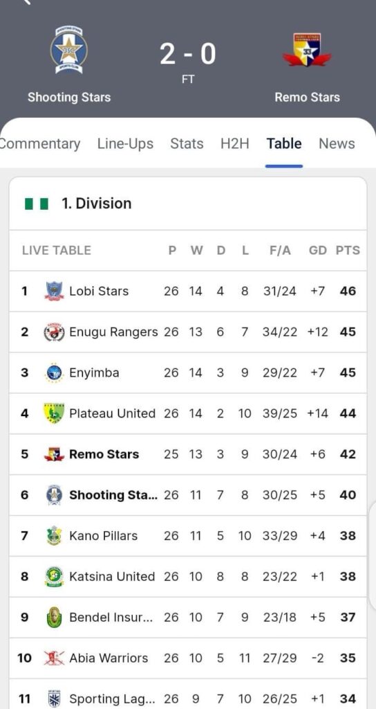 The win extends Shooting Stars’ unbeaten run to six games, propelling them to 6th place in the standings with 40 points and a +5 goal difference after 25 matches. Their next challenge will be an away match against Niger Tornadoes in Kaduna on Friday.