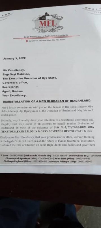 The legal practitioner in the letter said, “Now, may I draw your Excellency’s attention to the fact that in committing this aberration which changed the Ibadan chieftaincy customary law, the Olubadan chieftaincy declaration of 1957 was not amended and that remains extant.