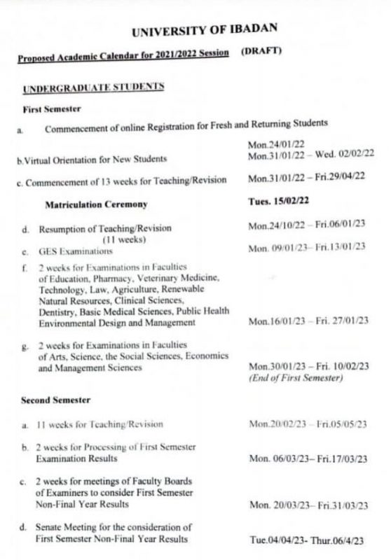 University of Ibadan management on Monday, 17th October 2022 released the official academic calendar for the 2021/2022 session.