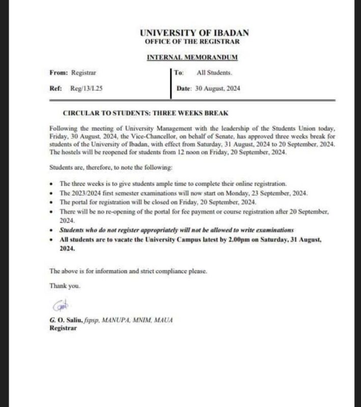 But in a circular closing the school for three weeks and addressed to all students, dated 30 August, 2024, the institution’s registrar, G. O. Saliu said the closure followed the meeting of the University’s management with the leadership of the student union on Friday 30 August, 2024, where the Vice-Chancellor on behalf of the senate approved three weeks break for students.