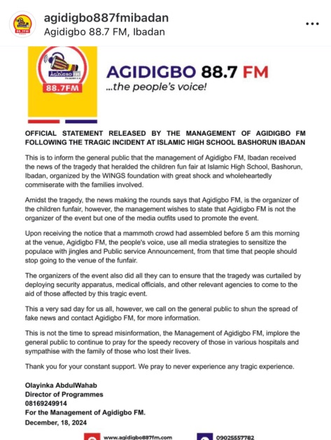 Following the tragic incident at the children’s funfair at Islamic High school, Bashorun in Ibadan on Wednesday, where many children were feared dead due to a stampede, The management of Agidigbo FM has released an official statement clarifying its role in the event.