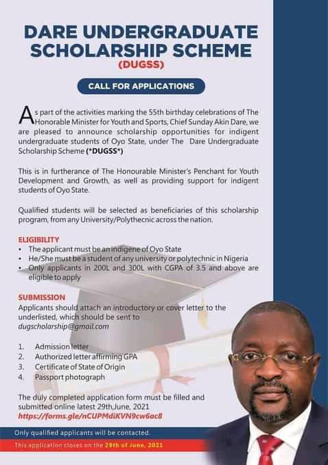To mark his 55th birthday in Ibadan, The Minister of Youth and Sports, Chief Sunday Dare has announced the launch of his scholarship scheme; the Dare Undergraduate Scholarship Scheme (DUGGS) to provide financial support for students from Oyo State to study at any Federal Higher Institution in Nigeria.